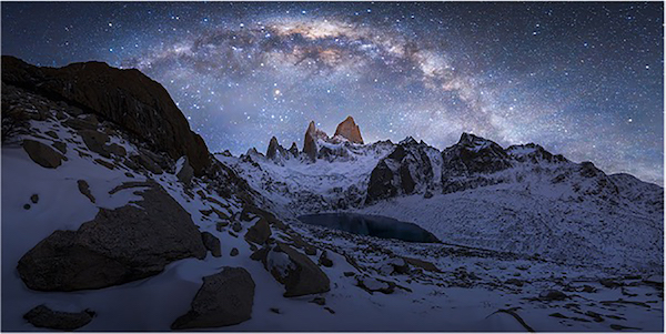 A snowstorm arrived. It swept through the mountains and rocks with heavy snow, and the temperature dropped to below -20°C. It was my ideal shooting condition, but the hillside was covered with snow and became hardly visible and dangerous. While finding my way to the spot, I fell into the gaps several times. I eventually spent 10 hours to reach the spot, and two nights on the cliff edge for the Milky Way shot. This panorama was created by stitching 44 shots together (4 rows with 11 shots in each row).”